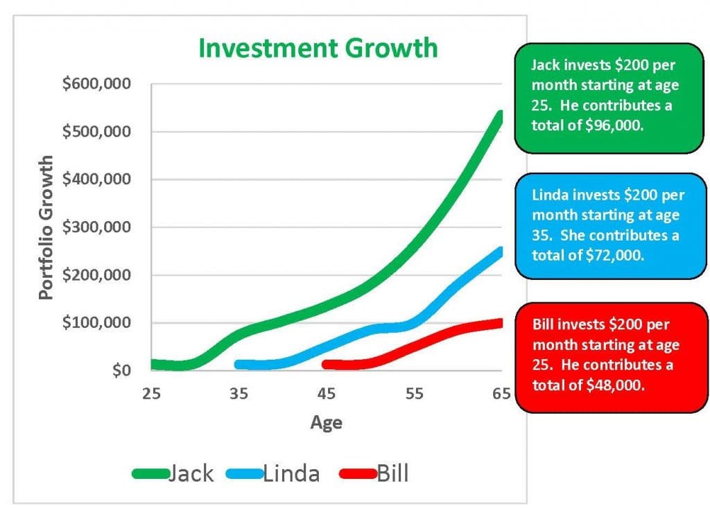 In the following example, all 3 employees invested $200 per month. Jack (green line) began investing at age 25. By the time he is 65 his portfolio is worth over $520,000. Linda (blue line) didn’t start investing until age 35, by age 65 her portfolio is only worth about $245,000. By waiting 10 years to start, she ends up with less than half of what Jack accumulates. Bill (red line) waited until he was making more money, he starts investing at age 45, after 20 years his portfolio barely gets up to $100,000.