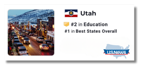 Utah was named the 2nd best state in the nation for education, just behind Florida, according to a U.S. News & World Report ranking released in May, 2024. The ranking was based on the performance of Utah’s K-12 schools and institutions of higher education. Among the K-12 metrics tracked by the magazine are preschool enrollment, eighth-grade NAEP scores (standardized testing), high school graduation rates, and college readiness (ACT/SAT) scores.