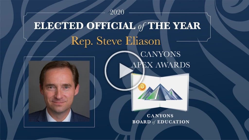 Rep. Steve Eliason well remembers the heart-breaking conversation that shaped the direction of his political career. Shortly after he was elected in 2011, Eliason attended a Youth Protection Seminar at Union Middle to discuss student suicide. It was there he spoke to a tearful father who pleaded with Eliason to do something to make a difference and help students struggling with mental illness. So Eliason did. In his time at the Legislature, Eliason has overseen legislation that increased funding for students through the weighted pupil unit, he shepherded the creation of the SafeUT app, established Youth Protection Seminars for schools throughout the state, and added funding to support additional counselors, nurses, and social workers in schools. As a result, the suicide rate in Utah has declined, while nationally, rates are still rising. Despite his essential role in supporting education throughout the state, Eliason quietly stays behind the scenes, orchestrating important legislation without fanfare. “In my mind, Steve Eliason is the most unsung hero in public education in the state of Utah,” said Canyons’ Director of External Relations Charlie Evans. “Everyone who cares about education owes him a deep debt of gratitude.” That debt of gratitude is one reason why Eliason has become the first person in the history of Canyons to receive two Apex Awards for Elected Official of the Year. Eliason first received the award in 2016. Now, as a token of gratitude and acknowledgement of all that Eliason has done to promote education in Utah, the Canyons Board of Education and Administration have selected Rep. Steve Eliason to receive the 2020 Apex Award for Elected Official of the Year.