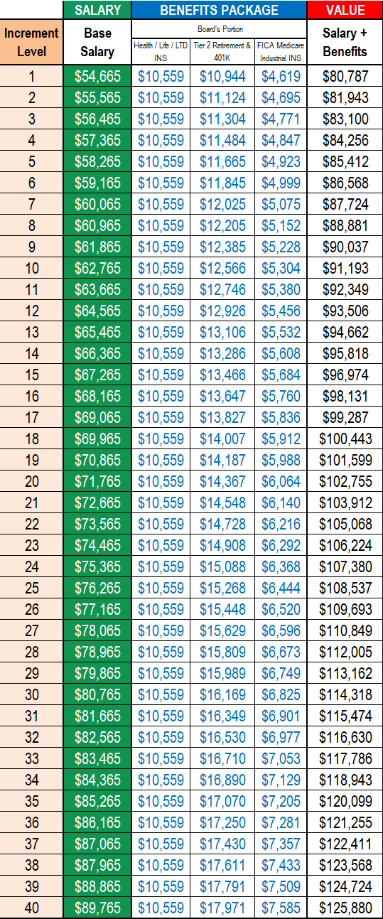Cost of Living Adjustment (COLA) is calculated on the mid-point of the salary schedule, Increment Level 20, minus ESA and TSSA funds. The dollar difference between Increment Levels is $950.