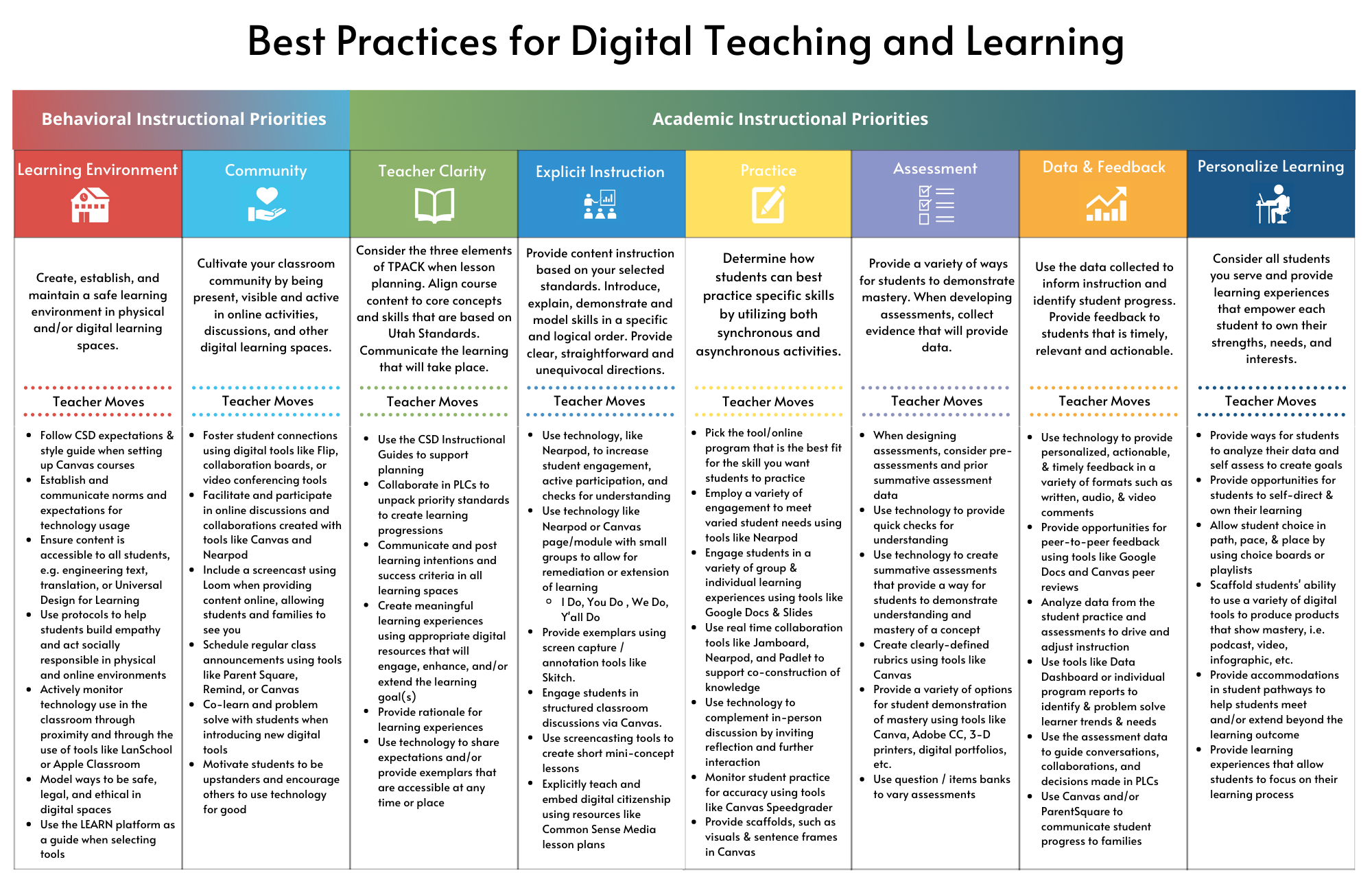 When the technology being used is not supporting the learning outcomes and providing a high learning level, the use of that technology in that situation should be reexamined or not used at all. The Best Practices for Digital Teaching and Learning directly align with CSD’s academic and behavioral instructional priorities, and were identified to support teachers in determining when to integrate technology into their instruction and student learning experiences.