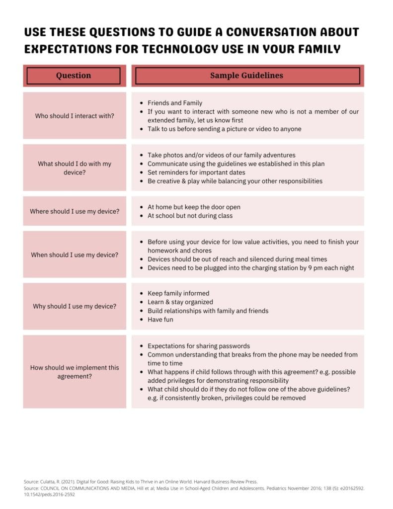 Setting guidelines for how technology use will be monitored should be a part of a family’s Media Use Plan. Simply put, a Media Use plan is a document explaining how, when, and for what purpose devices should be used. Collaborating on the development of the Family Media Use plan can be a great tool for having conversations about appropriate use of digital tools. The contents of the Media Use plan will vary based on your child’s age, demonstrated responsibility with devices, and the overall culture of your family. Families may want to consider including a statement in their plan that content on digital devices is not private and may be reviewed by a parent/guardian at any time. This is not a breach of trust but rather a proactive step to promote responsible online behavior and protect their well-being.