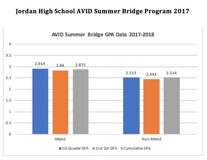 Made possible with an investment by the Board of Education, and modeled after a similar program at Hillcrest High, the AVID summer academy is now in its second year. Participants in last year’s academy ended their ninth-grade year with higher grade point averages than those students who were invited to the program but chose not to participate (see chart below). They reported having more confidence and also attended school more regularly.