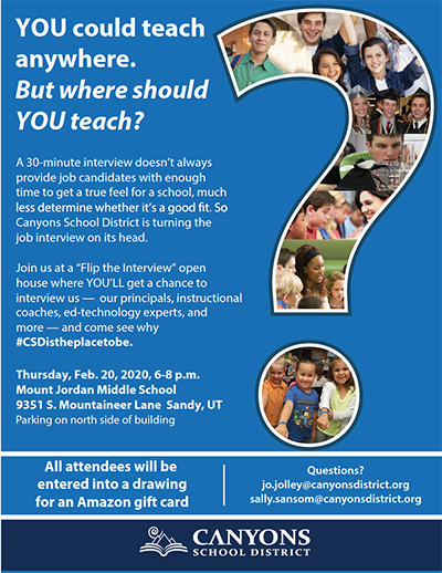 Teaching candidates who are interested in getting to know Canyons a little better are invited to a free “Flip the Interview” Open House on Thursday, Feb. 20, 6-8 p.m. The event, held at Mount Jordan Middle, 9351 S. Mountaineer Lane in Sandy, is an opportunity for hiring prospects to interview us our principals, instructional coaches, and more to become better acquainted with our schools and our culture.