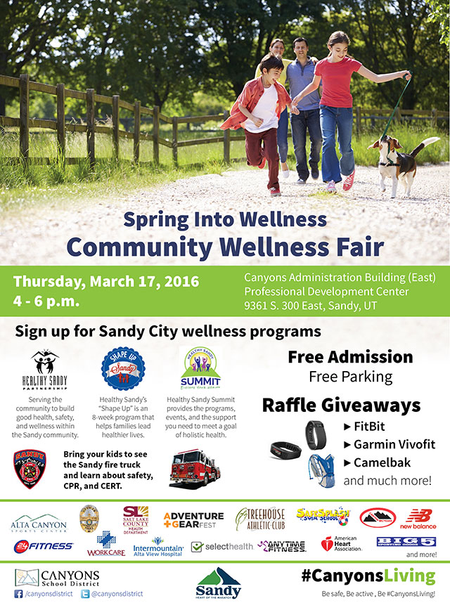 Winter is on the wane. So it’s time to start thinking about getting into shape for swimsuit season. Canyons District’s Wellness Committee is teaming up with Sandy City to sponsor a free Community Wellness Fair from 4-6 p.m. on Thursday, March 17. The fair will be in the Canyons Administration Building-East, 9361 S. 300 East. Employees also are invited to sign up and participate in Healthy Sandy’s “Shape Up” eight-week program that was designed to help residents lead healthier lives. Vendors who have signed up to have booths at the wellness fair include Big 5 Sporting Goods, Anytime Fitness, Dick’s Sporting Goods, Canyon Bicycles and 24 Hour Fitness. Event organizers will be holding a raffle to give away a FitBit, Garmin Vivofit, and a Camelbak, among other items.