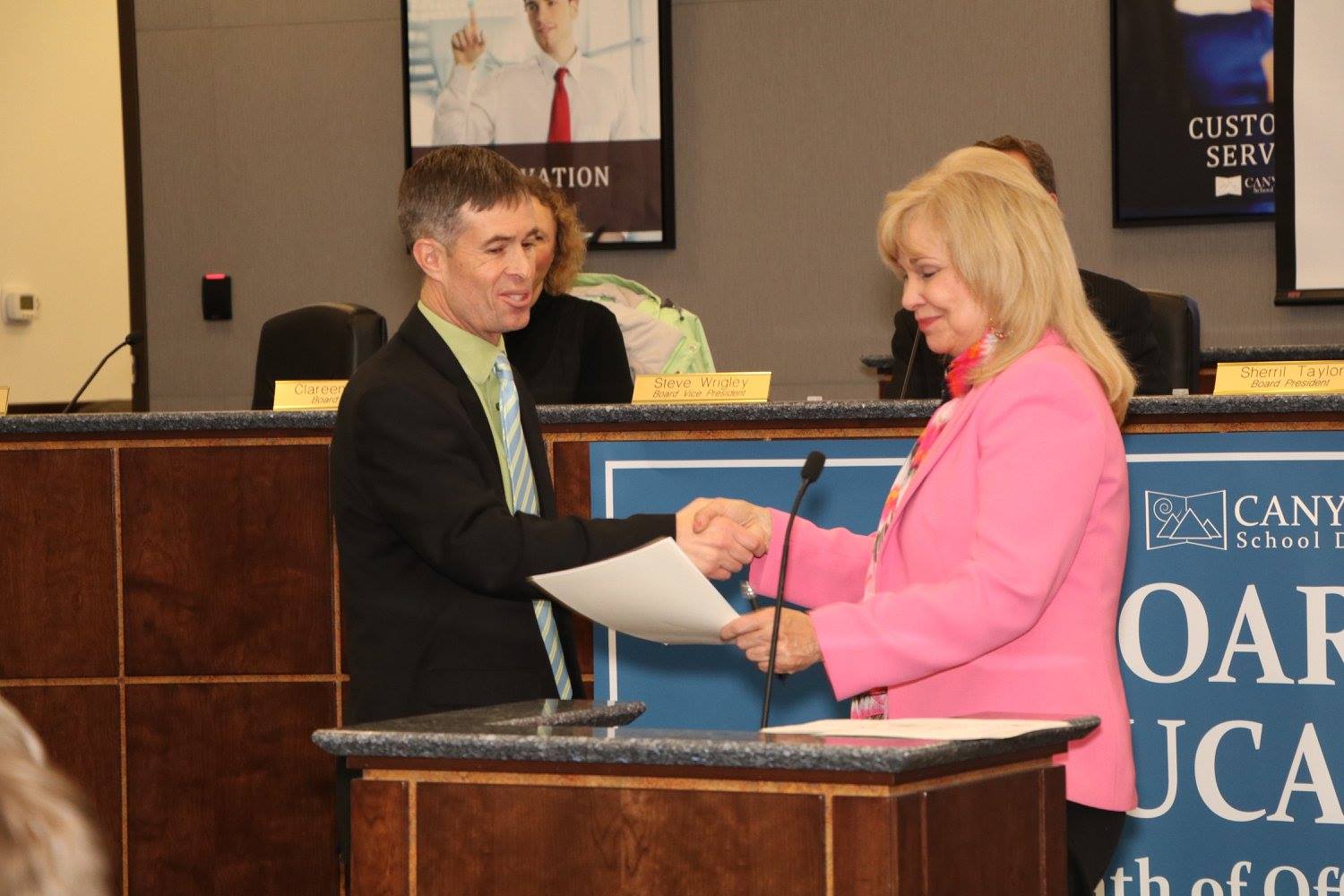 Millerberg told the audience at the ceremony and reception in the Board Chambers of the Canyons Administration Building-East, 9361 S. 300 East, that “it’s really, really good to be back on the Canyons Board of Education. “