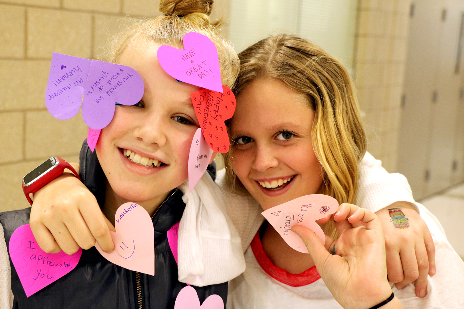 As Service Club members filed into a classroom after school on Feb. 13 and began laying 1,600 hearts out on tables in preparation to distribute them, the task seemed daunting. Barely 30 minutes later, sixth grader Colin Derr returned to the room to grab another handful of hearts and was astonished to find the job was complete; affixed to every locker in the school was an uplifting message. Many hands, it seems, make light work and warm hearts.