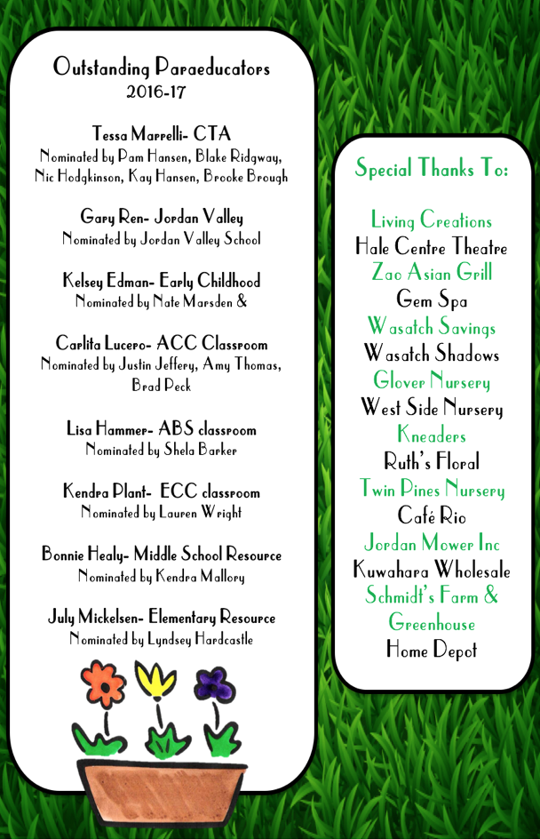 Schools simply can’t operate effectively without them, and to show our appreciation, Canyons District’s Department of Special Education each year honors thebest in the business. Congratulations to the winners of CSD’s 2017 Outstanding Paraeducator Awards: