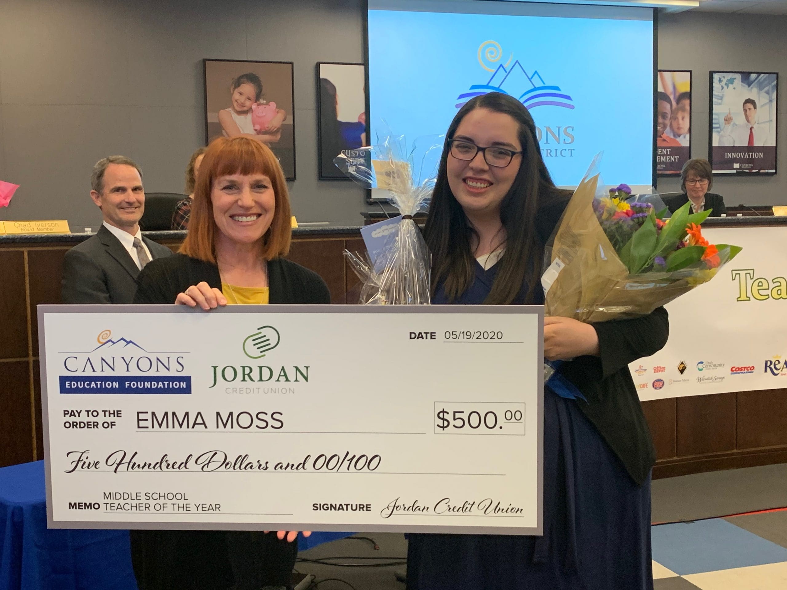 Moss has been praised for her ability to connect with all students. She received a $1,000 cash award through Jordan Credit Union for being named Canyons’ Teacher of the Year.