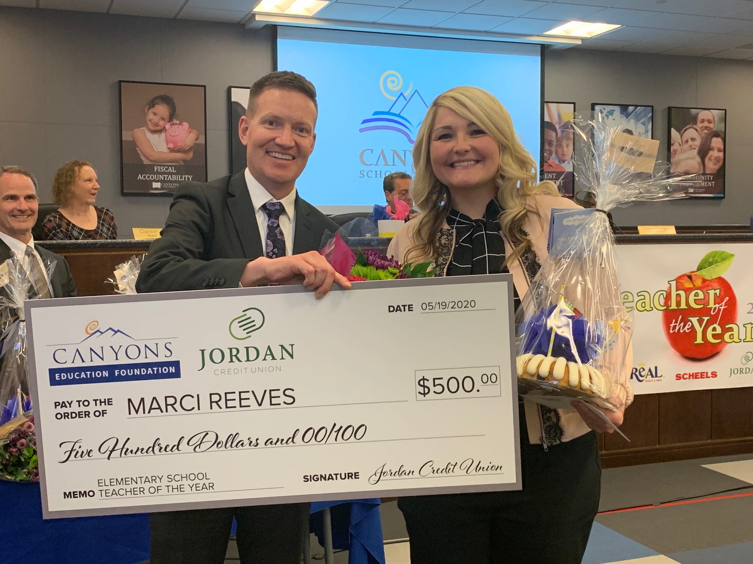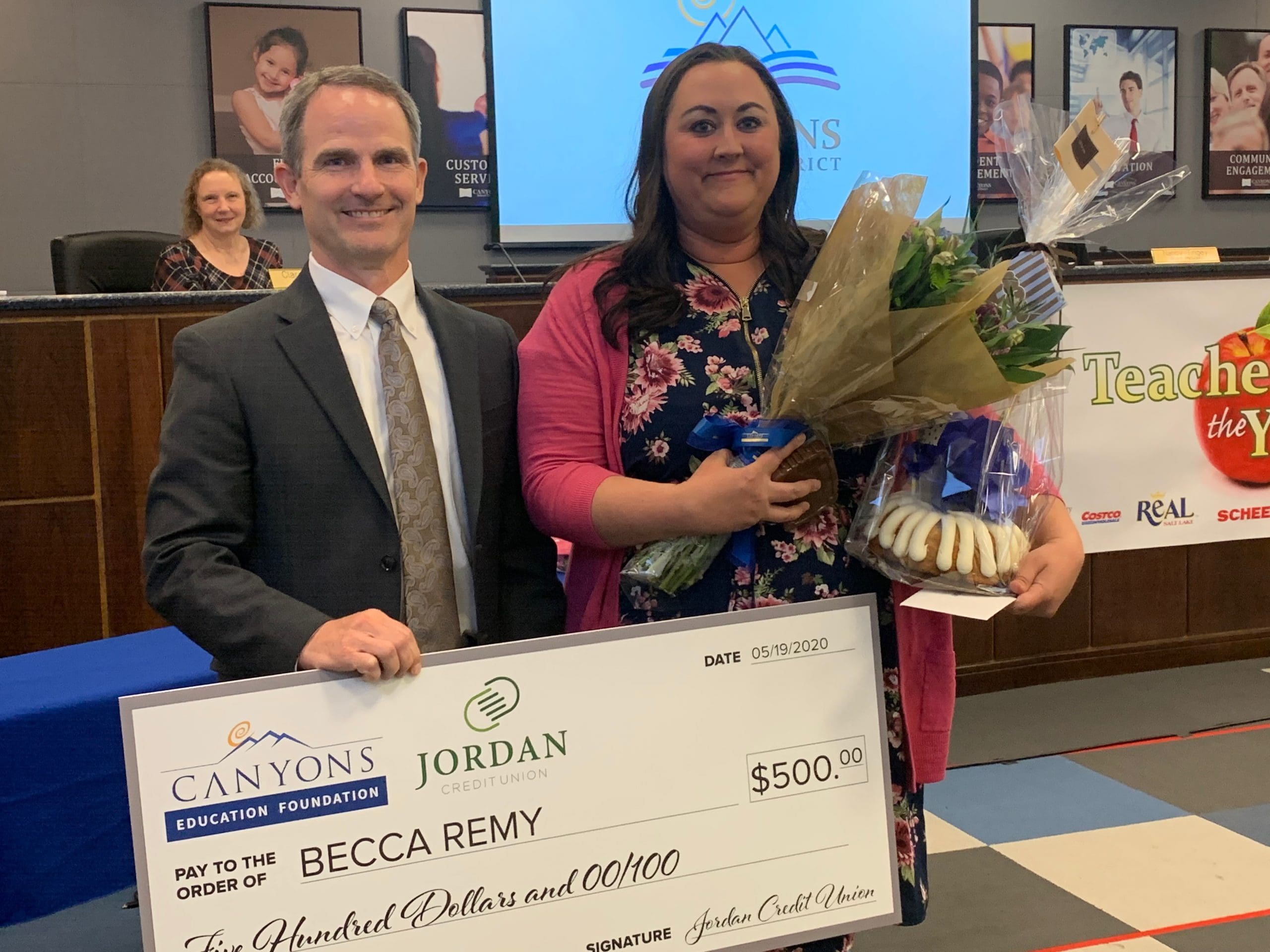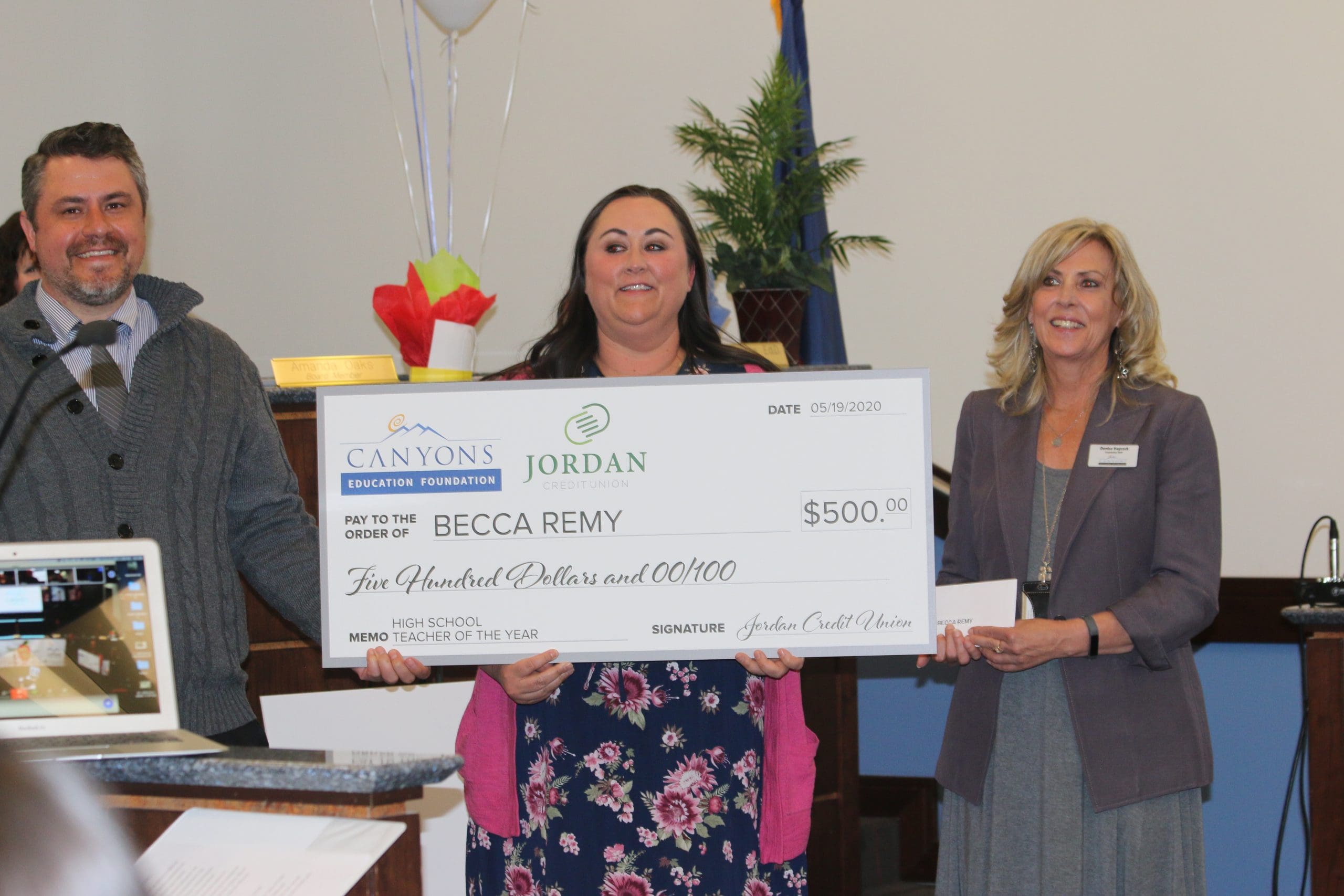 As Canyons’ Teacher of the Year, she receives a $1,000 cash prize from the Jordan Credit Union. The third-year teacher, who earlier this year was named Utah’s New Career and Technical Education Teacher of the Year, received the award during a special ceremony hosted by the Canyons Board of Education at the Canyons District Office, 9361 S. 300 East. The event was broadcast via Facebook Live.
