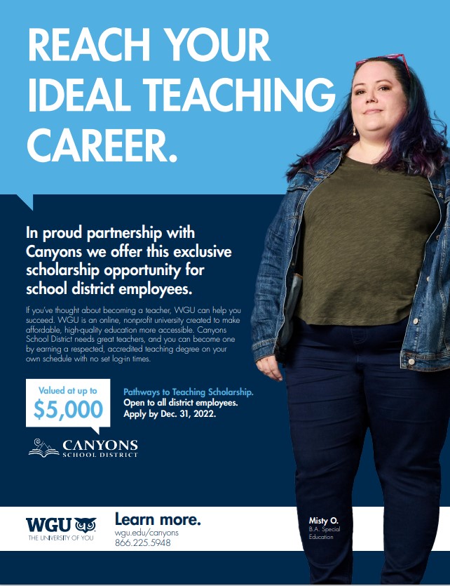 All Canyons District employees are eligible to apply for the scholarships, but must first apply for admission to WGU. The application deadline for the $5,000 Pathways to Teaching Scholarship is Dec. 31, 2022 (see flier below). Information on the K-12 Partner Scholarship and other benefits can be found here.