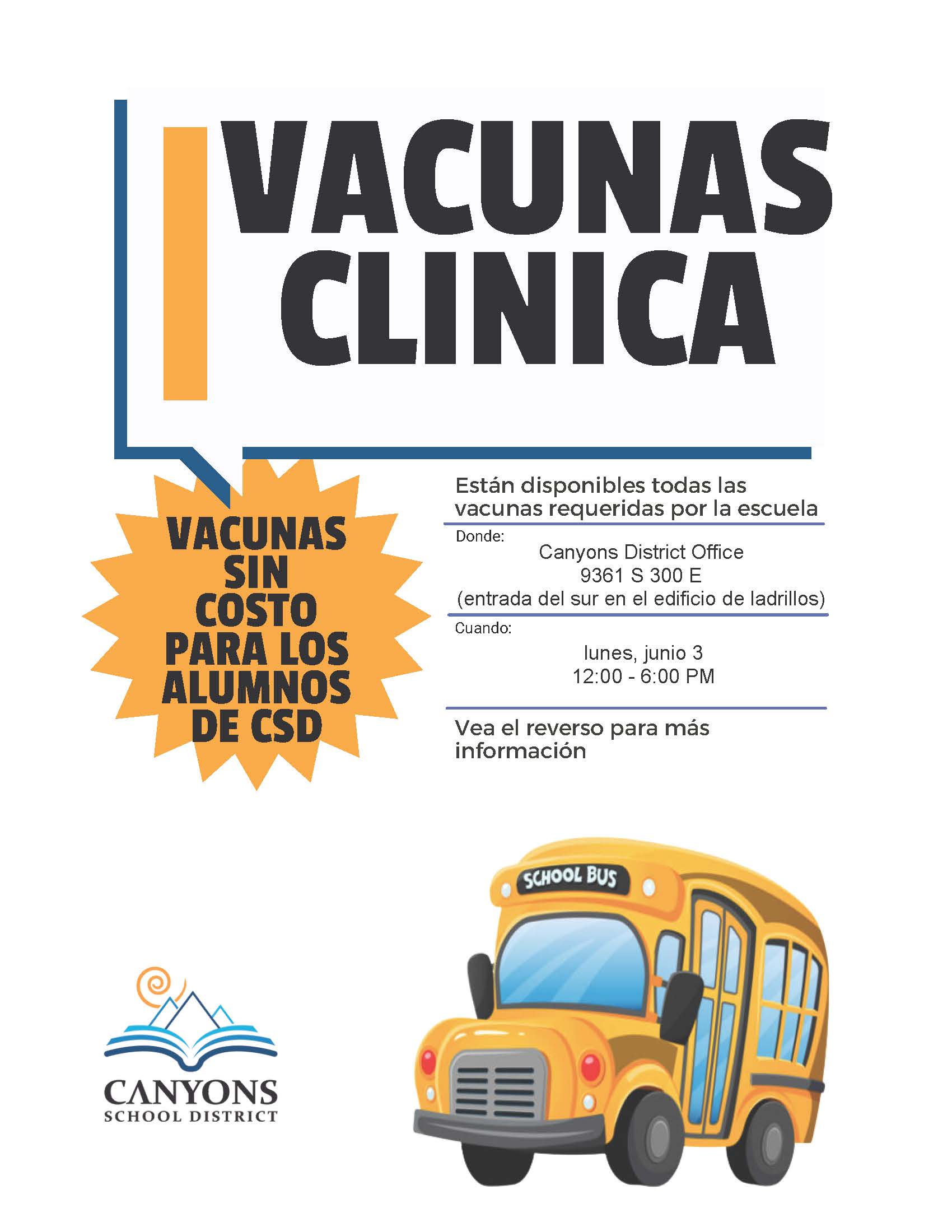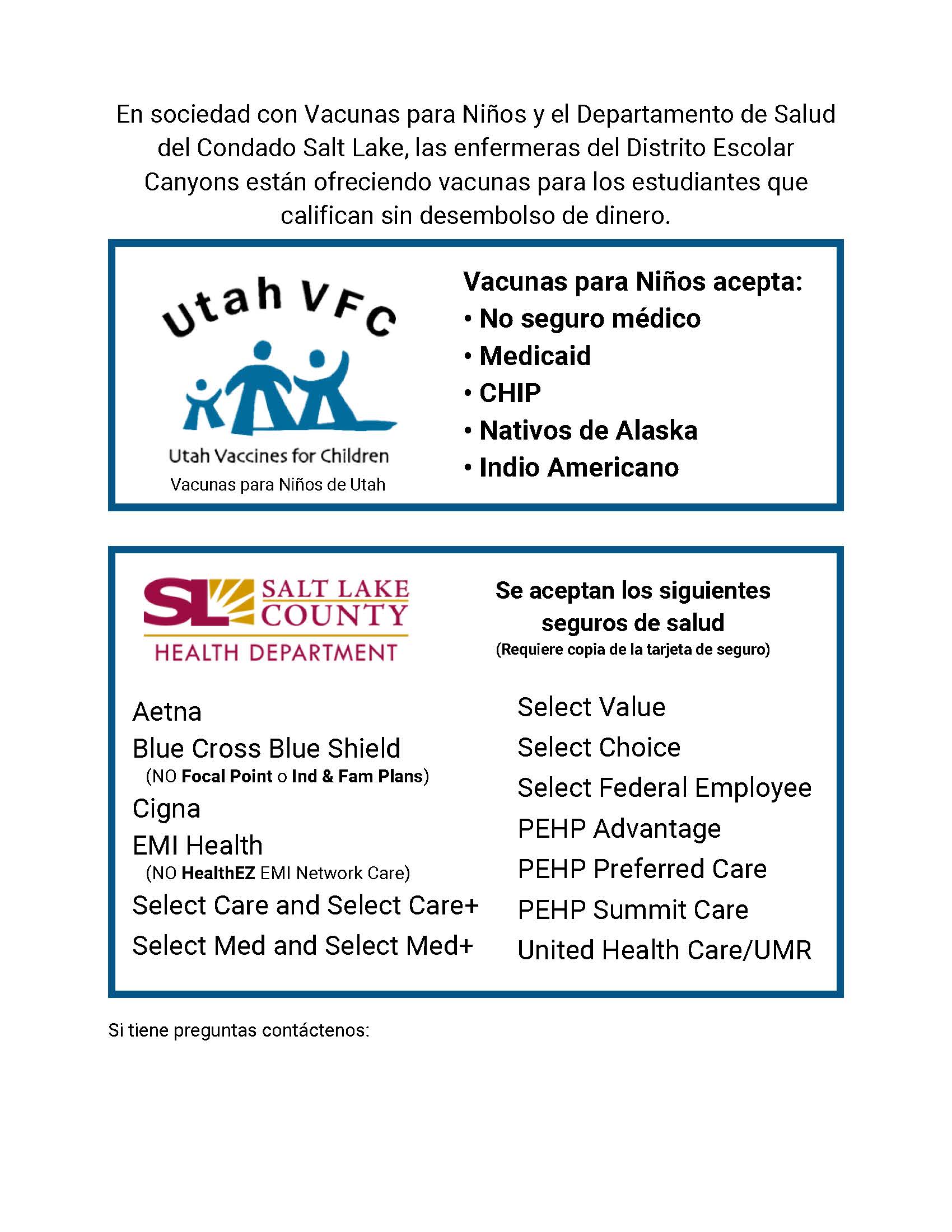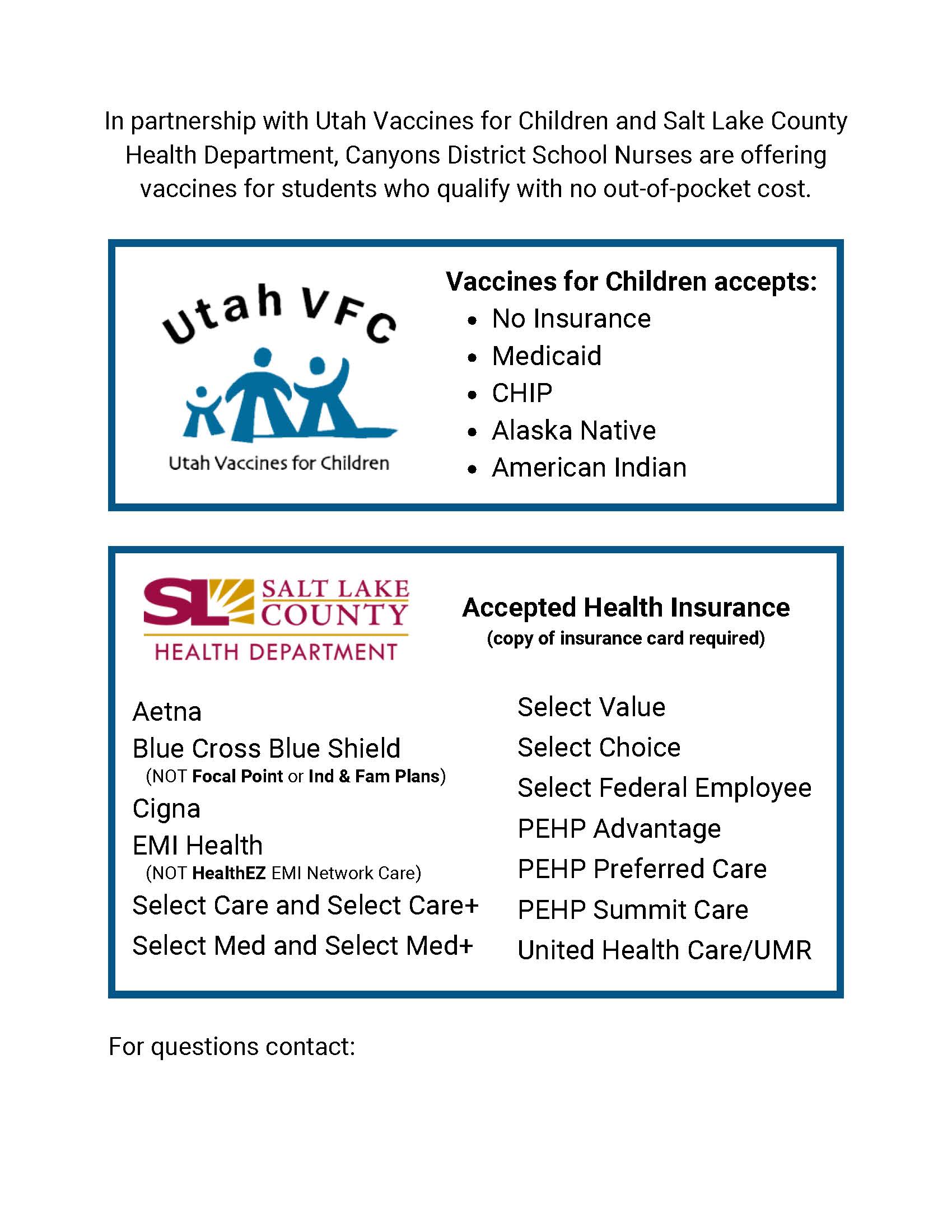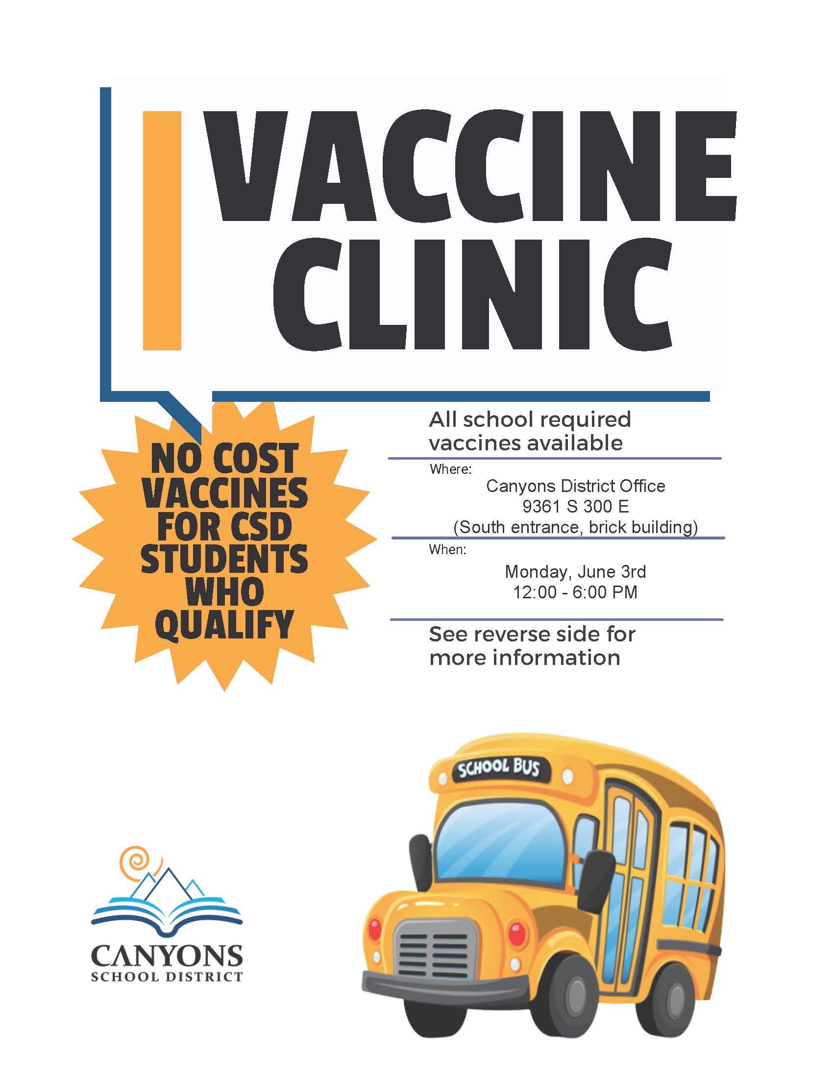 On June 3, the District will hold a vaccine clinic for all school required vaccines. The District is partnering with Utah Vaccines for Children and Salt Lake County Health Department to offer vaccines to students who qualify with no out-of-pocket cost.