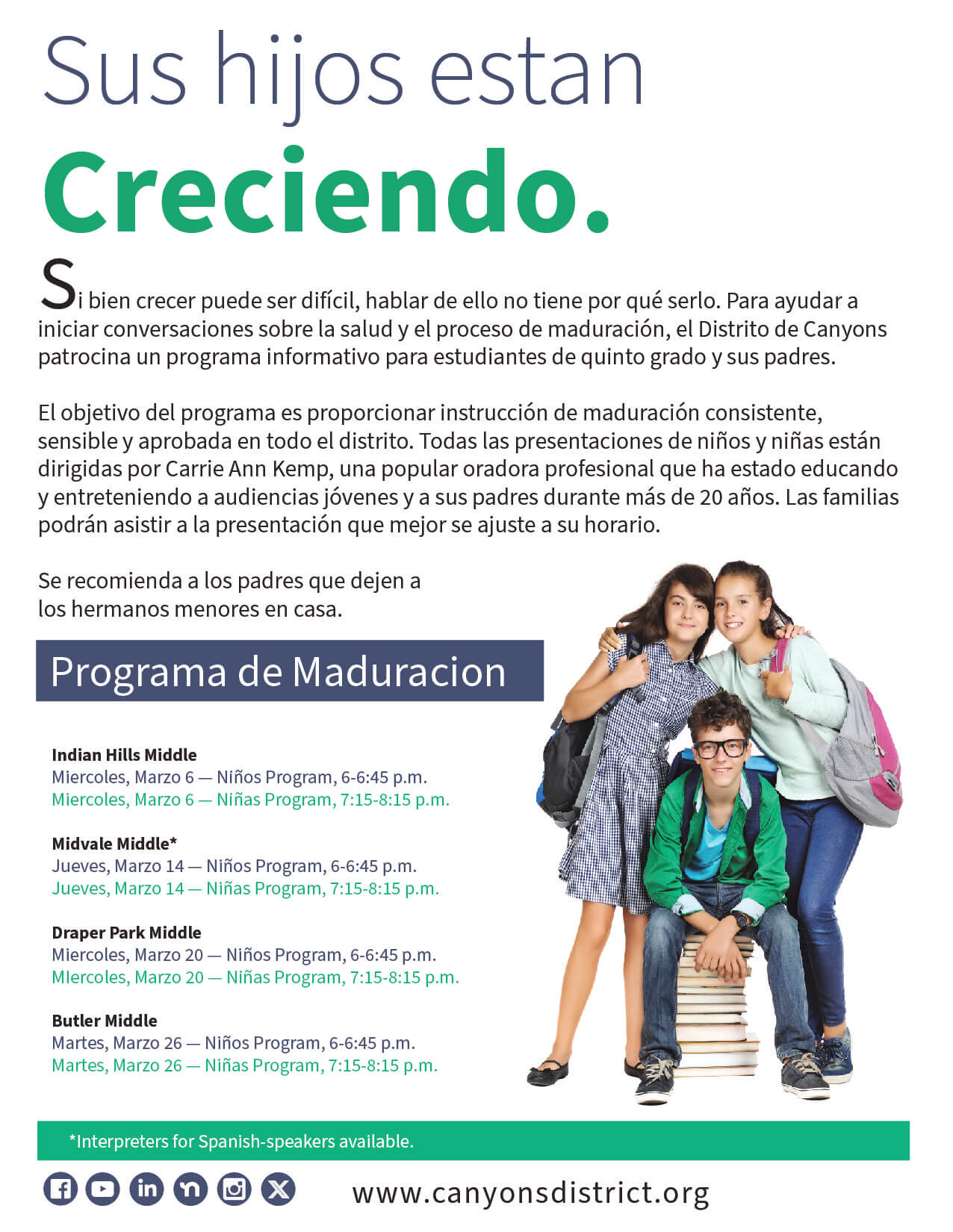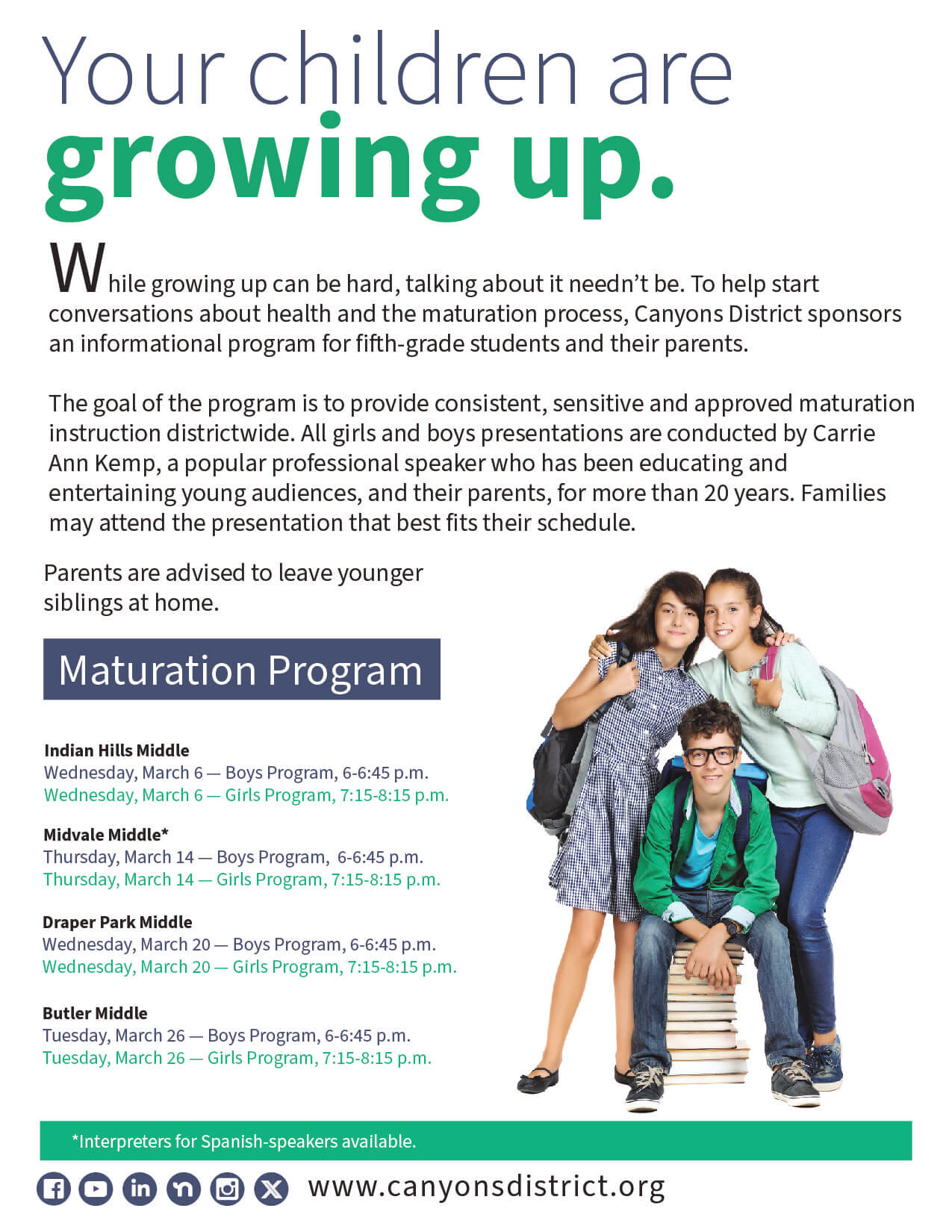 Each year, CSD sponsors an informational program for fifth-grade students and their parents with the aim of providing consistent, sensitive and approved health and maturation instruction districtwide. All girls and boys presentations are conducted by Carrie Ann Kemp, a professional speaker who has been educating and entertaining young audiences, and their parents, for nearly 25 years.