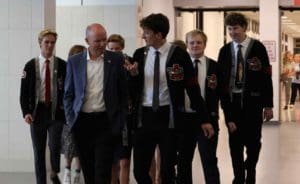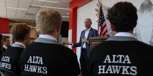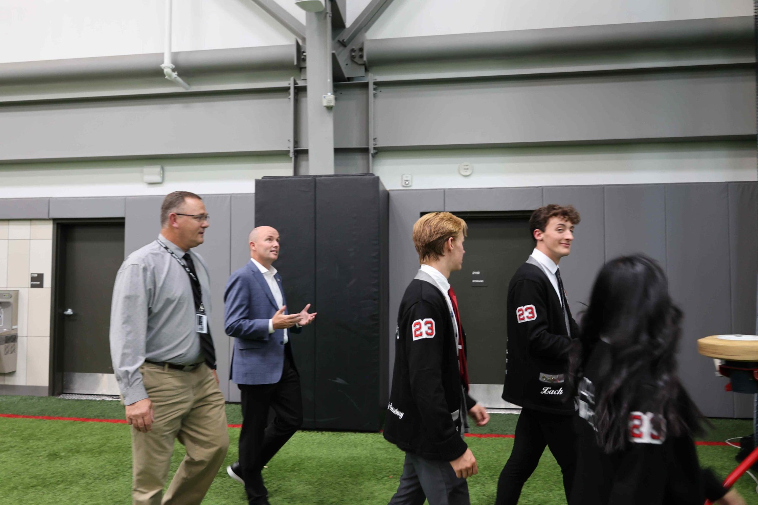 After a quick tour of the new student commons area and the Alta High fieldhouse, Gov. Cox thanked Alta High’s student leaders for their hospitality and commented on the beauty of the facility. From the second floor of the new AHS fieldhouse, he noted the sight of the football field and the mountain range. “This is quite the view,” he said.