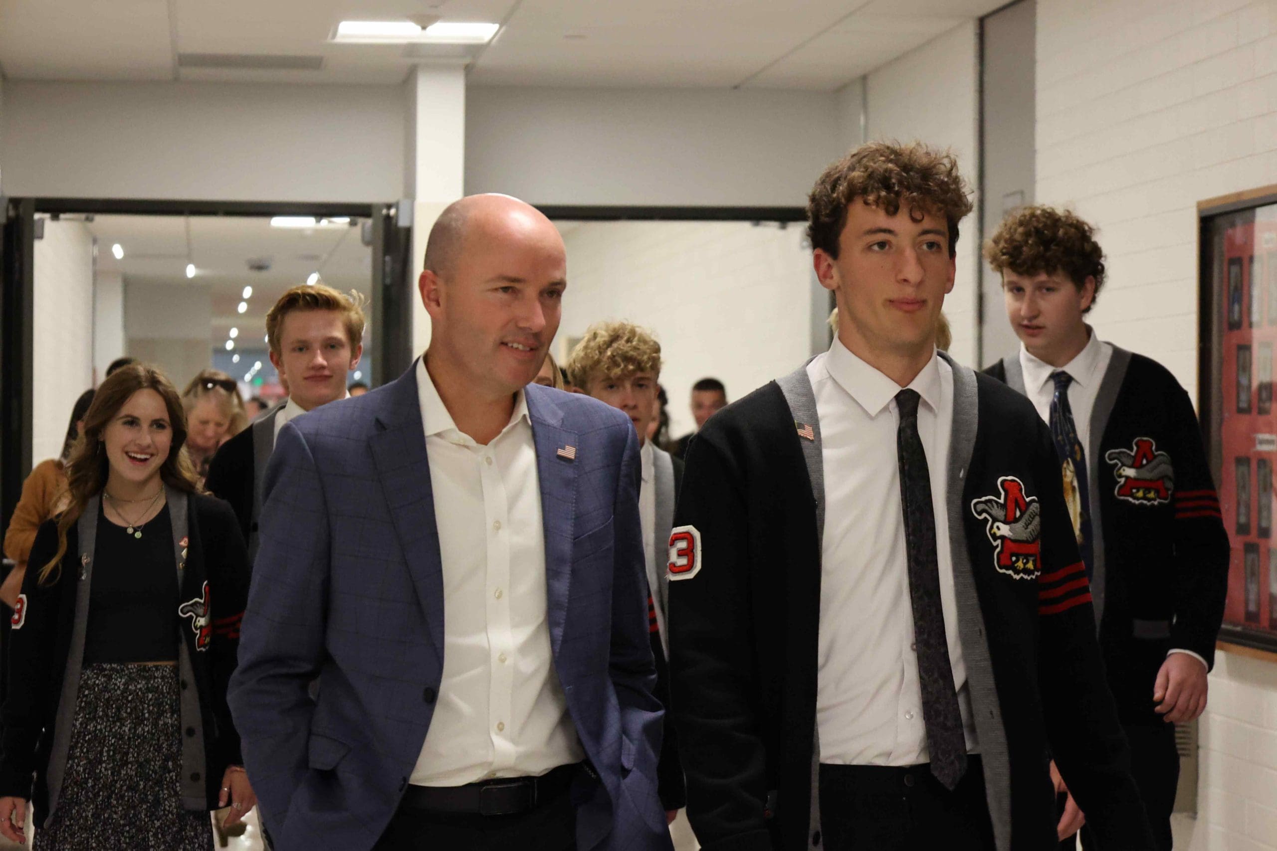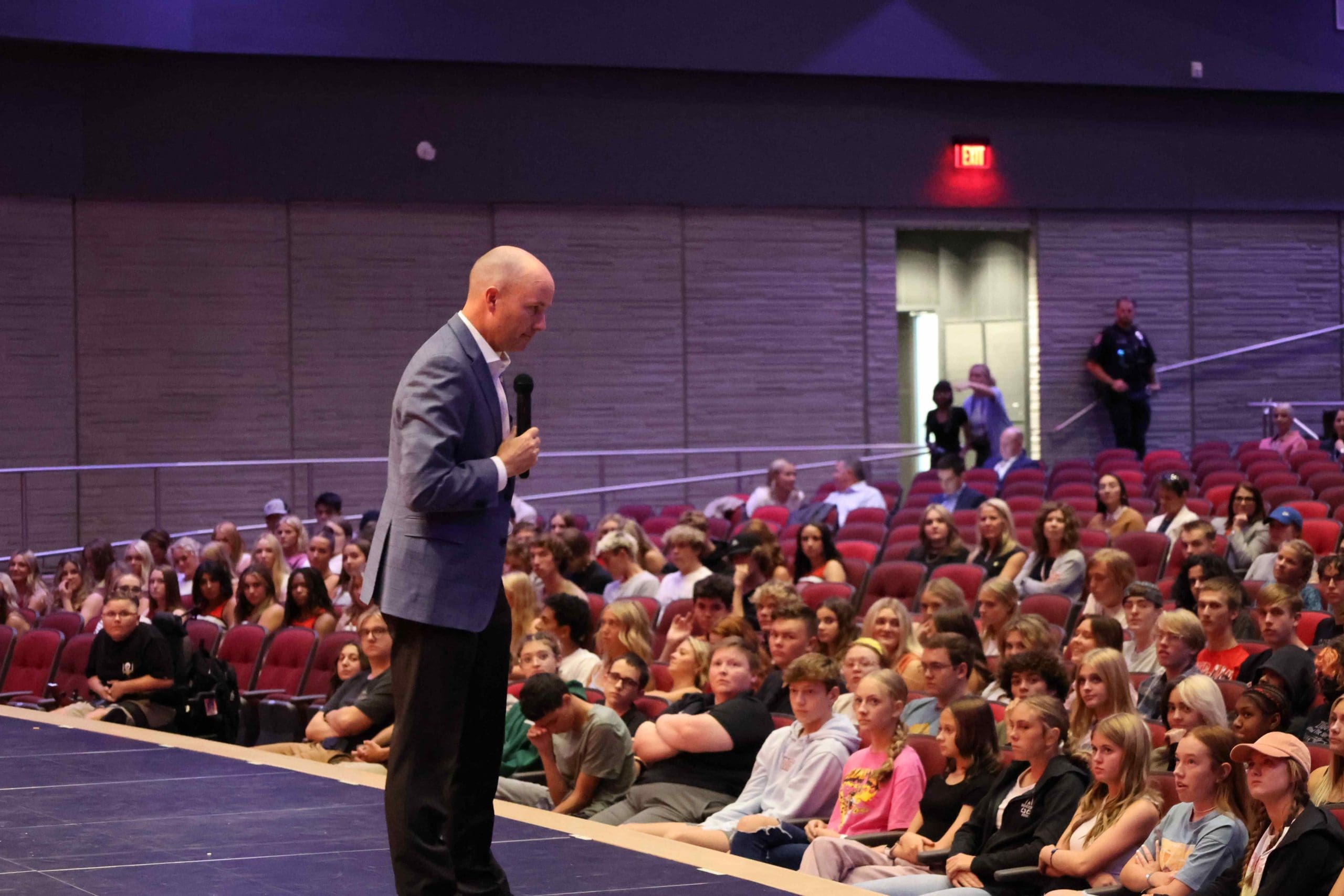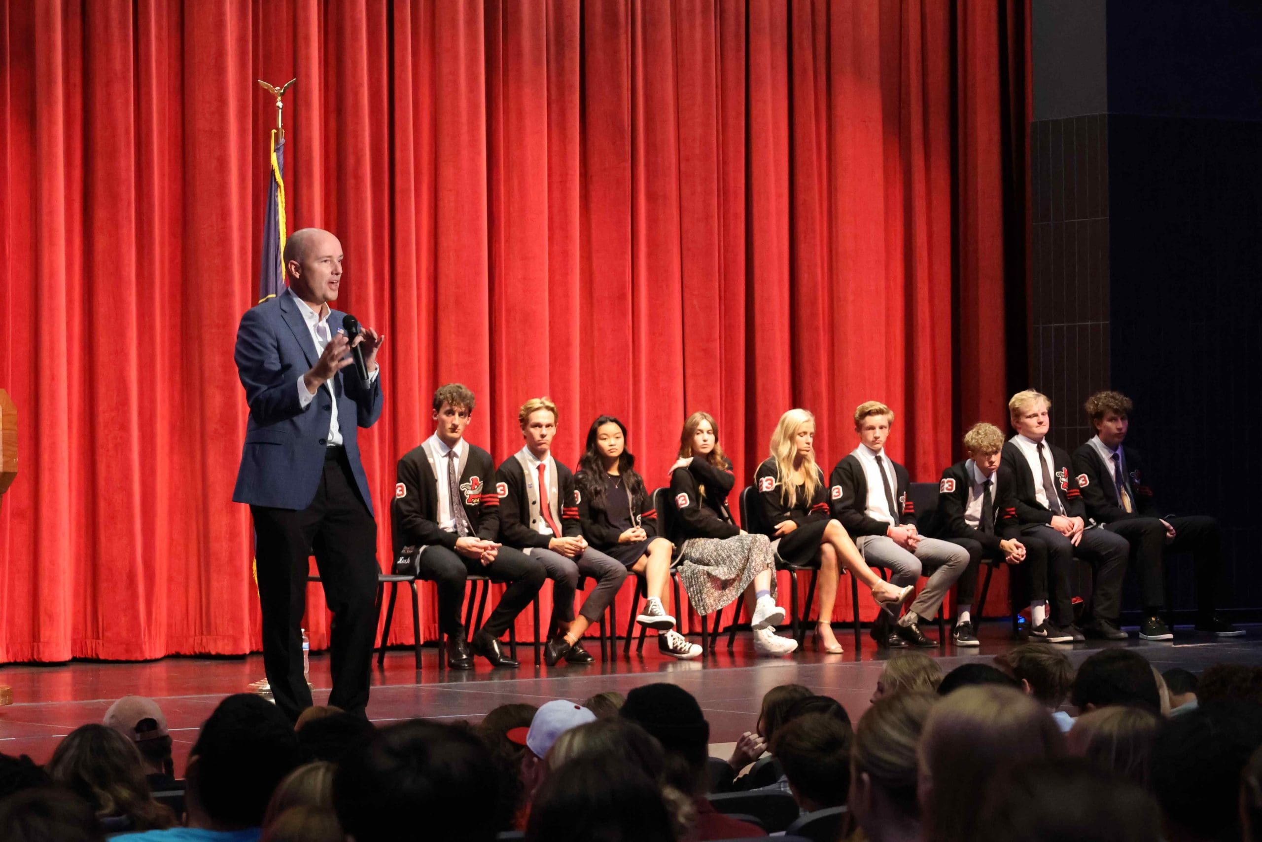 Cox’s visit to the home of the Hawks was the first-ever gubernatorial visit to a Canyons school in the District’s history. Cox arrived shortly after 1 p.m. in a pitch-black sport-utility vehicle, and quickly hopped out to shake the hands of the student-government leaders who were waiting to greet him in front of the Sandy-area school.