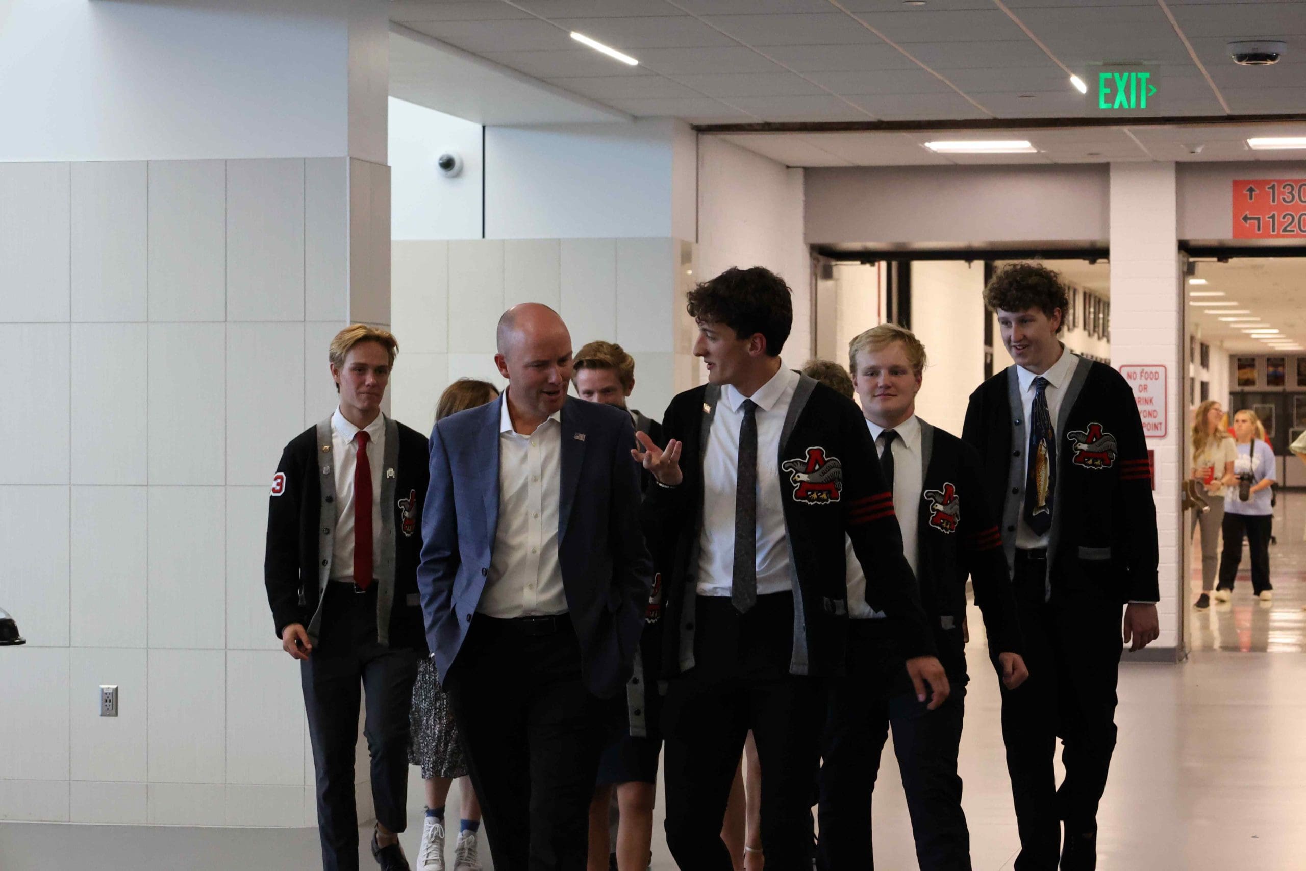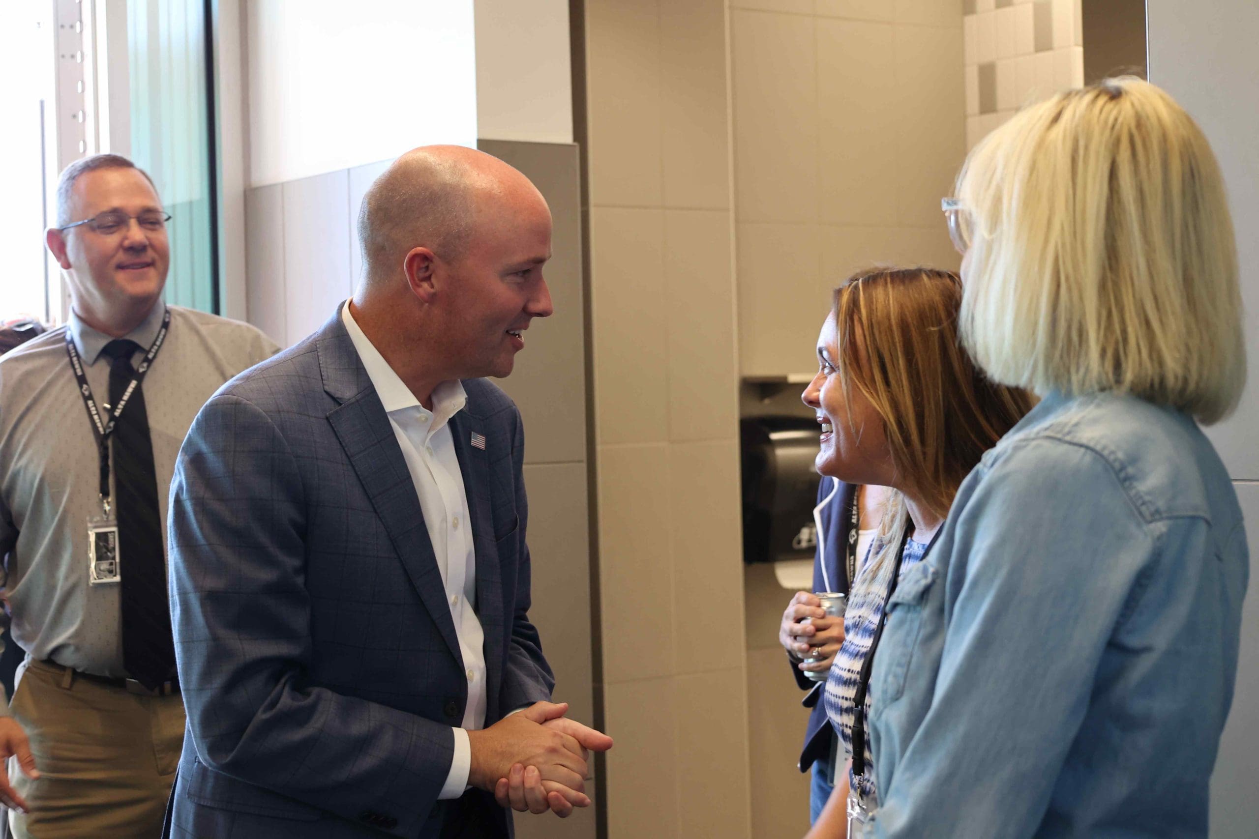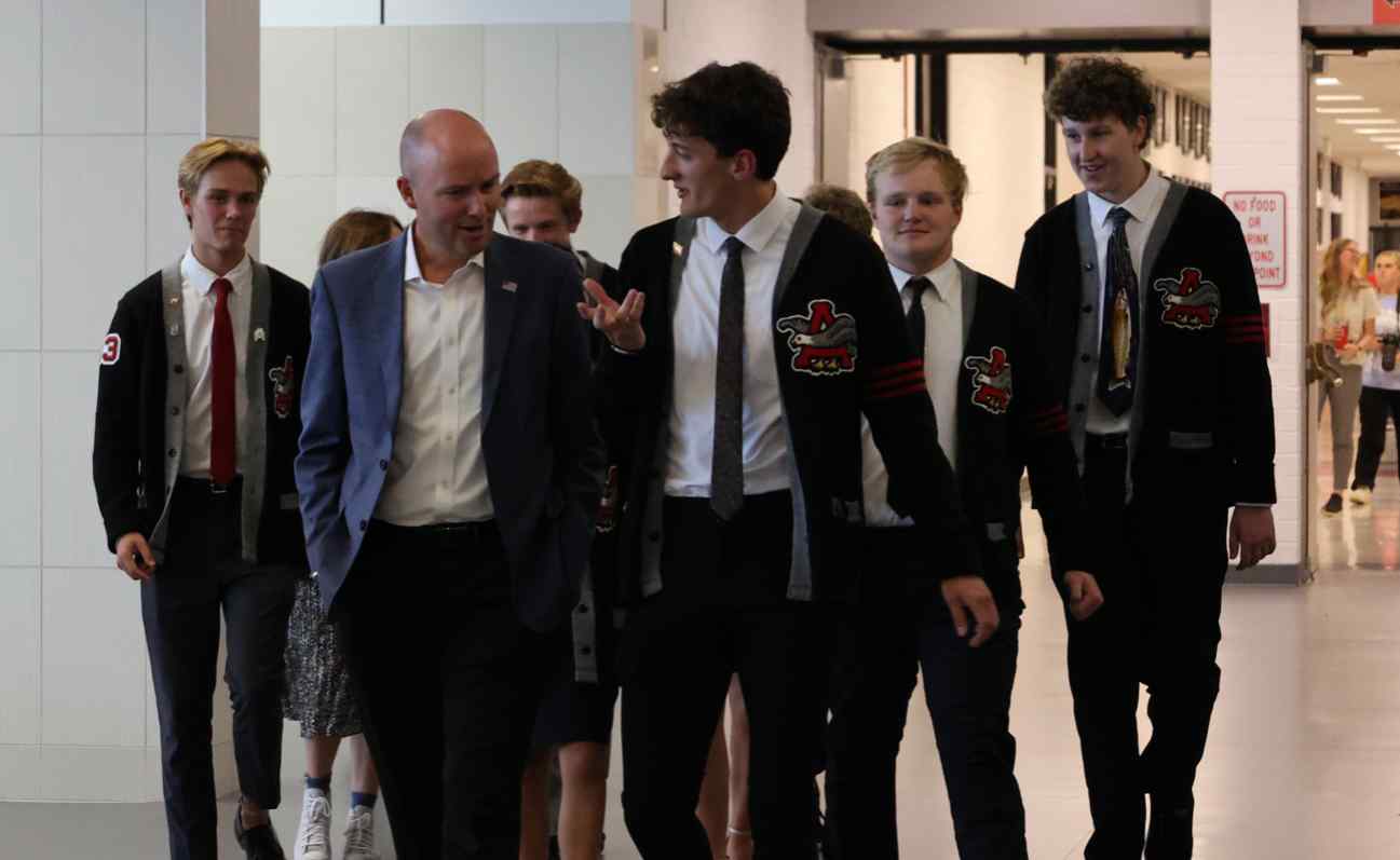 Cox’s visit to the home of the Hawks was the first-ever gubernatorial visit to a Canyons school in the District’s history. Cox arrived shortly after 1 p.m. in a pitch-black sport-utility vehicle, and quickly hopped out to shake the hands of the student-government leaders who were waiting to greet him in front of the Sandy-area school.