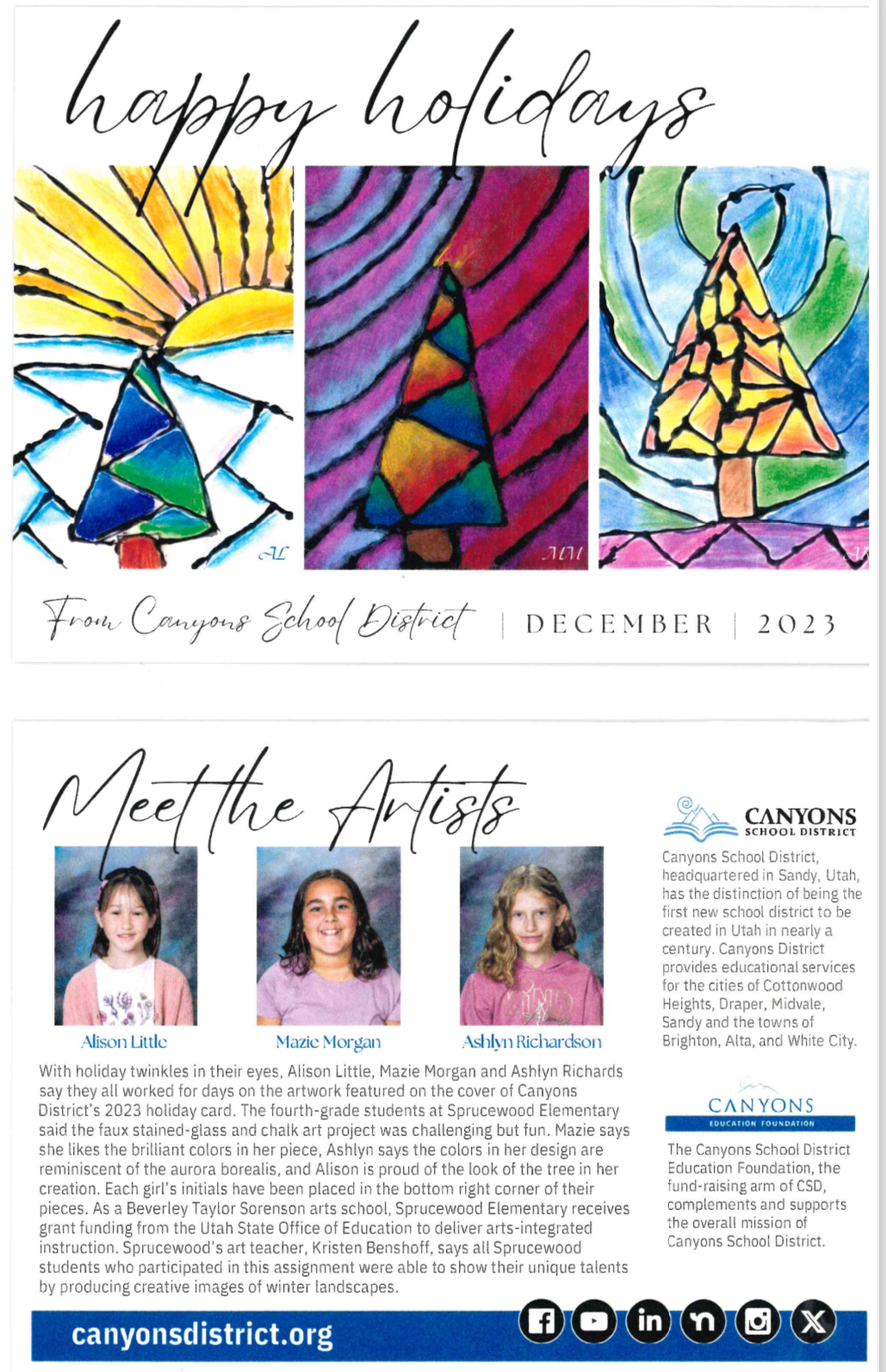 A trio of Sprucewood Elementary fourth-grader students created the design for the District’s 2023 holiday card, which has been sent to local mayors, city councils, legislators, CSD’s major donors, community partners, Utah’s Congressional delegation and the Office of First Lady Dr. Jill Biden at the White House.