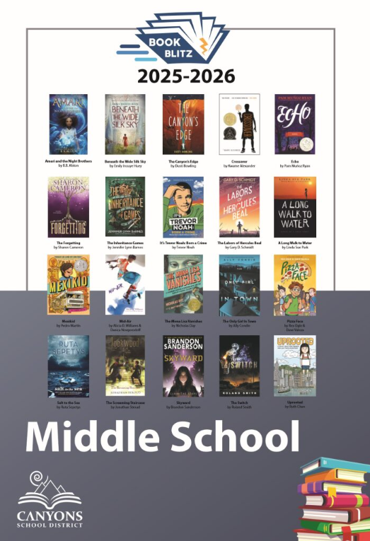 Coached by their teacher-librarians, teams of no more than five students collaborate throughout the school year to read and study a curated list of twenty books. The selected titles vary in genre, reading level, and theme, offering a range of perspectives, characters, and authors. The Book Blitz season culminates in high-energy, Jeopardy-style competitions where teams demonstrate their knowledge of the books. Each school hosts a school-based competition, and the top two teams advance to a district-level championship to compete against the winning teams from other Canyons middle schools.