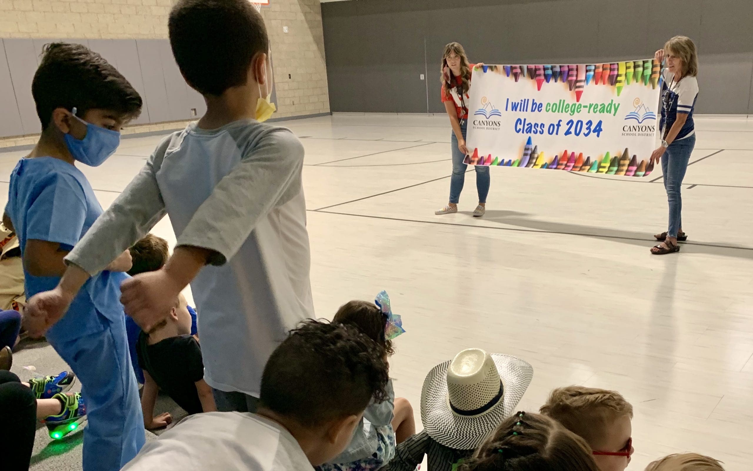 Such dream-building activities are a proud tradition in Canyons District, the perfect cap to the first week of kindergarten for the Class of 2034. Schools across the district set aside time to emphasize the importance of working hard every day in elementary, middle and high school to be ready for the rigors of college and careers after graduation. All schools were provided “Class of 2034” banners and every kindergarten student received a wristband that declared, “I will be ready for college … Class of 2034.”