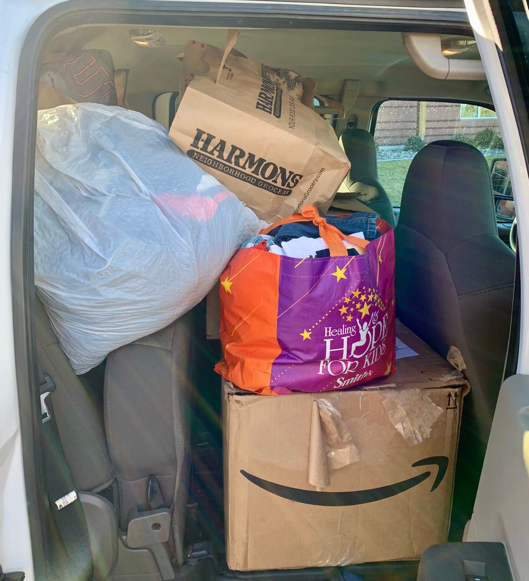 After gathering oodles of donations at school, the students loaded dozens of bags into Principal Chip Watts’ truck for the special and large delivery. The truck’s big 8-foot-long bed and backseat were bursting at the seams with clothing, shoes, and other items.